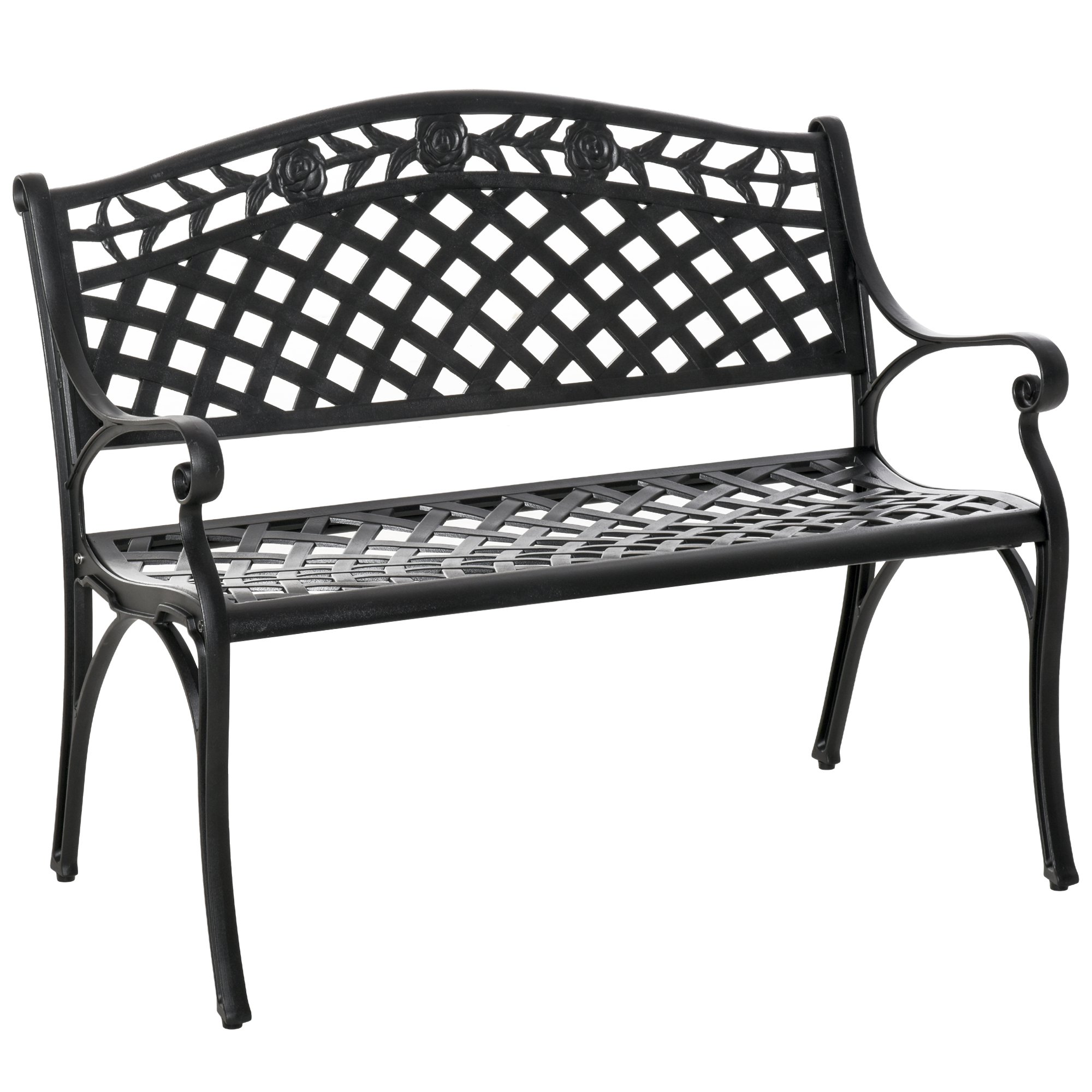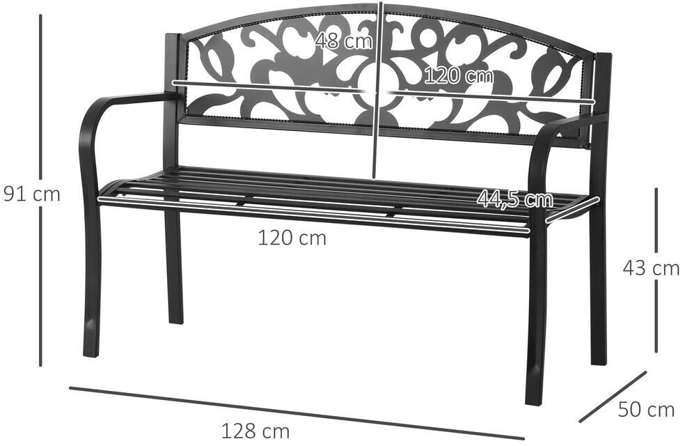Perfekt für gemütliche Stunden im Freien! Die Outsunny Gartenbank bietet Platz für zwei Personen und sieht dabei noch richtig stylisch aus. Mit der dekorativen Rückenlehne im Metall-Design wird sie zum echten Hingucker auf deiner Terrasse oder dem Balkon.\\n\\n• Robust & langlebig: Aus pulverbeschichtetem Stahlrohr gefertigt\\n• Bequem: Mit Armlehnen und leicht gewölbter Sitzfläche\\n• Praktisch: Lamellensitz für schnelle Trocknung nach Regen\\n• Maße: 128 x 62,5 x 81,5 cm (L x B x H)\\n• Sitzfläche: 120 x 41 x 42,5 cm\\n• Maximale Belastung: 240 kg\\n\\nEinfach aufbauen und sofort entspannen! Die Bank ist ideal für Garten, Poolbereich oder den eigenen Hof. Achte bitte darauf, sie sicher zu montieren und bei starkem Wind reinzuholen. Regelmäßige Pflege hält sie lange schön!