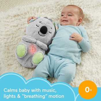 Einfach niedlich! Dieser süße Koala von Fisher-Price ist die perfekte Spieluhr für dein Baby ab Geburt. Der weiche Plüsch fühlt sich super kuschelig an und die samtigen Öhrchen sowie angenähten Schleifchen laden zum Ertasten ein. Besonders beruhigend: 20 Minuten Wiedergabezeit mit sanfter Gute-Nacht-Musik, weißem Rauschen oder anderen Beruhigungsklängen - alles mit Lautstärkeregler für die perfekte Einstellung. Du kannst die Spieluhr am Kinderwagen, der Babytasche oder am Bettchen befestigen - so ist sie immer dabei, ob zuhause oder unterwegs. Entwickelt von Fisher-Price Experten fördert sie die sensorische Entwicklung, baut Ängste ab und hilft beim Aufbau von Routinen. Einfach einschalten und dein Baby in den Schlaf wiegen - oder für entspannte Spielmomente sorgen. Ein tolles Geschenk zur Geburt oder für die ersten Lebensmonate!