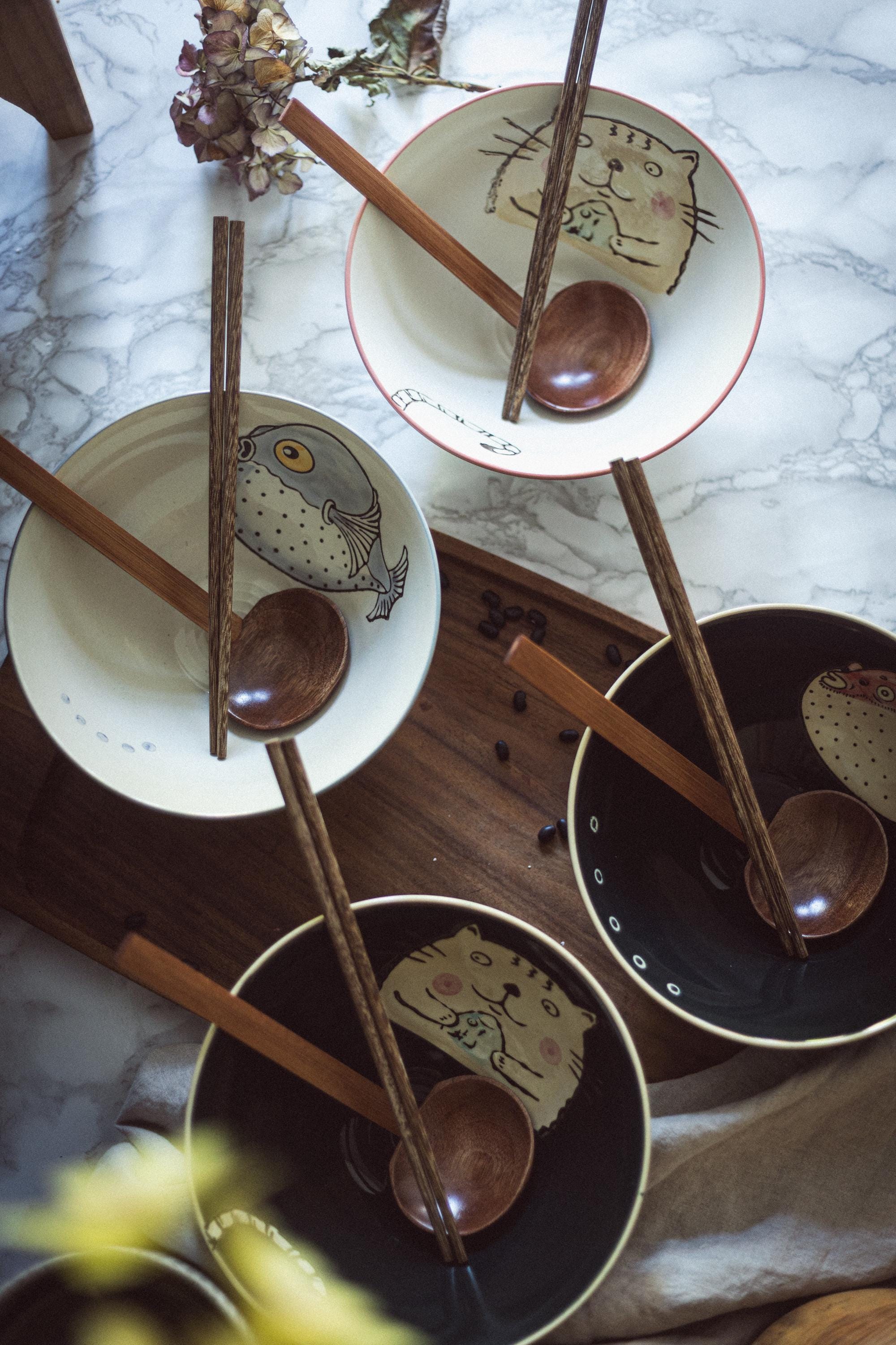 Ramen Schüssel Set 2-tlg 1000ml - Keramik Suppenschalen Mit Löffel & Stäbchen