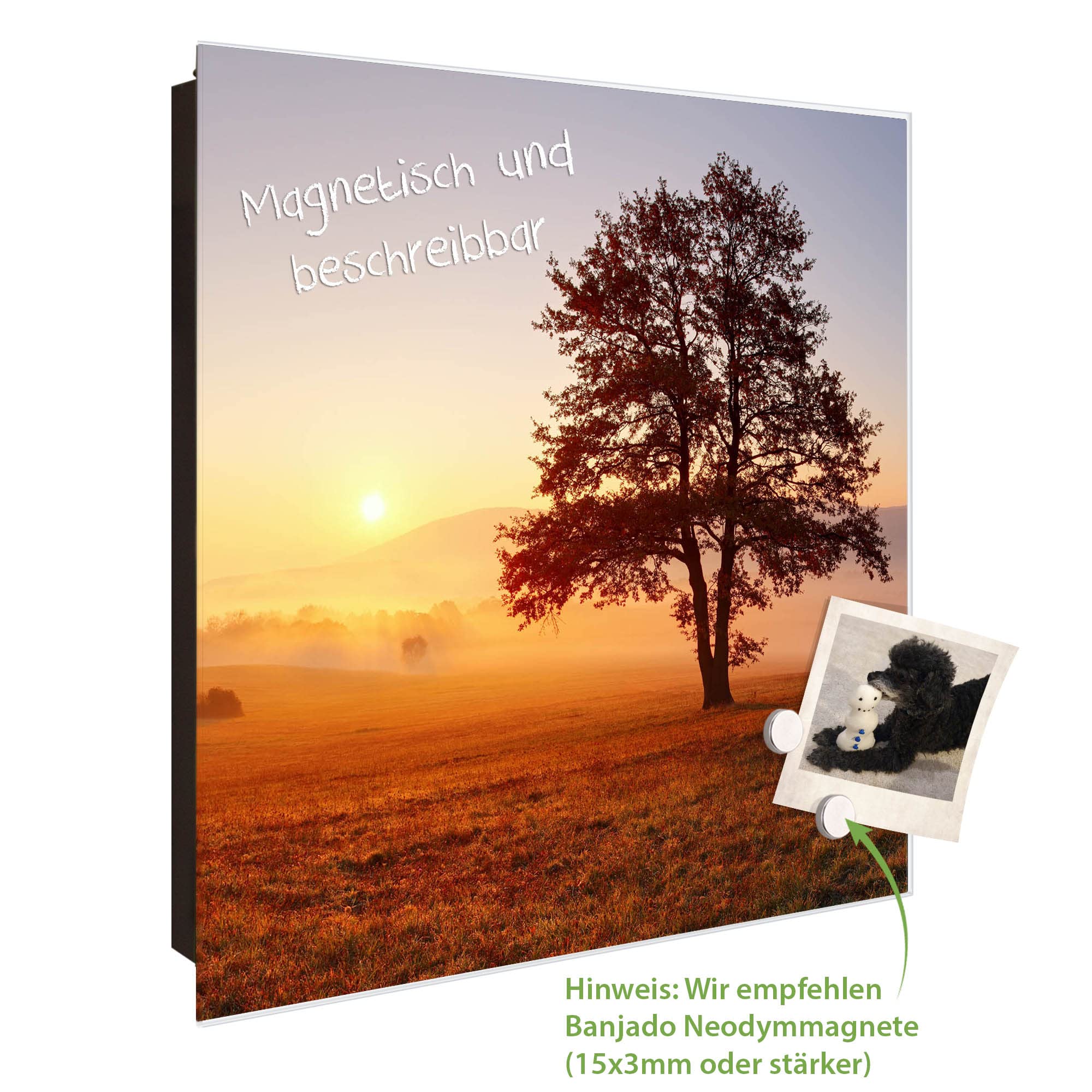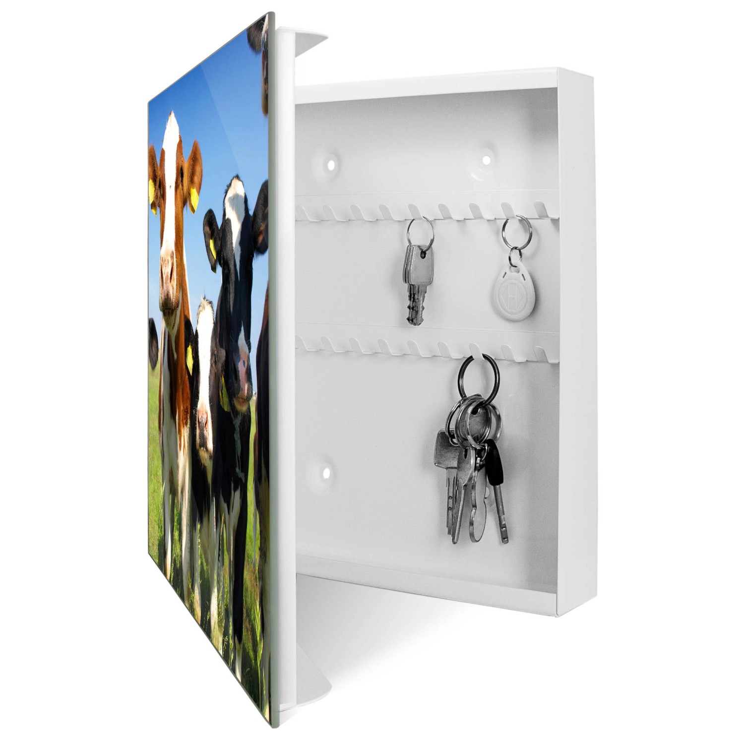 Mann, mit diesem Schlüsselkasten findet endlich jeder Schlüssel sofort seinen Platz! Der banjado Schlüsselkasten ist mit satten 50 Haken ausgestattet - da passt wirklich jede Menge rein. Die Glastür ist nicht nur ein echter Hingucker, sondern kannst du sogar mit Kreide beschreiben oder mit Magneten bekleben. Super praktisch für Notizen oder Erinnerungen! Mit den Maßen 30x30 cm und 5 cm Tiefe findet das Teil an fast jeder Wand Platz. Die Montage ist kein Problem - das benötigte Material liegt schon bei. Aus robustem Stahlblech gefertigt, hält der Kasten ewig. Und das coole Comic-Hund-Motiv macht richtig was her! Perfekt für den Flur, die Wohnung oder auch das Büro. Übrigens: banjado ist ein kleiner Betrieb aus Sachsen - da kriegst du echte Handarbeit und keine billige Massenware. Einfach aufhängen, Schlüssel rein - und nie wieder suchen müssen!