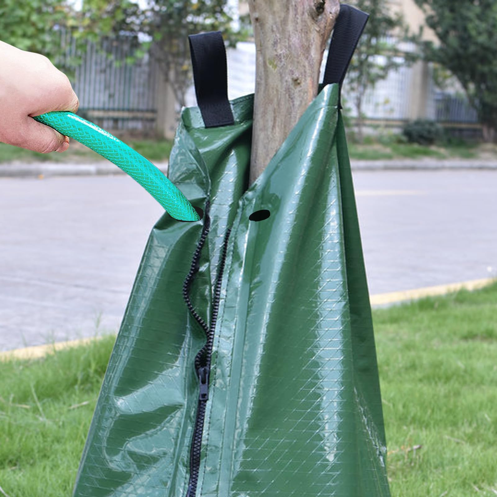 Gib deinen Bäumen die perfekte Wasserversorgung mit diesen praktischen Bewässerungsbeuteln von HonGien! Jeder Beutel fasst stolze 75 Liter (20 Gallonen) und gibt das Wasser langsam und gleichmäßig über mehrere Stunden ab - ideal für eine tiefe und effektive Bewässerung, die bis zu den Wurzeln vordringt. Hergestellt aus hochfestem, umweltfreundlichem PVC-Material, sind die Beutel robust, wetterbeständig und halten auch bei regelmäßigem Gebrauch lange. Der praktische Tragegriff und der breite Wassereinlass machen das Befüllen super einfach. Einfach den Beutel um den Baumstamm legen, mit Wasser füllen und den Reißverschluss schließen. Das Wasser sickert dann langsam durch kleine Löcher im Boden des Beutels in den Boden. Perfekt für junge Bäume, die besondere Pflege brauchen, oder für trockene Perioden, in denen deine Bäume extra Wasser benötigen. Ob im Hausgarten, Park oder in der Landwirtschaft - diese Bewässerungsbeutel sind vielseitig einsetzbar und sparen dir Zeit und Wasser. Im Set sind 3 Beutel enthalten, sodass du mehrere Bäume gleichzeitig versorgen kannst.