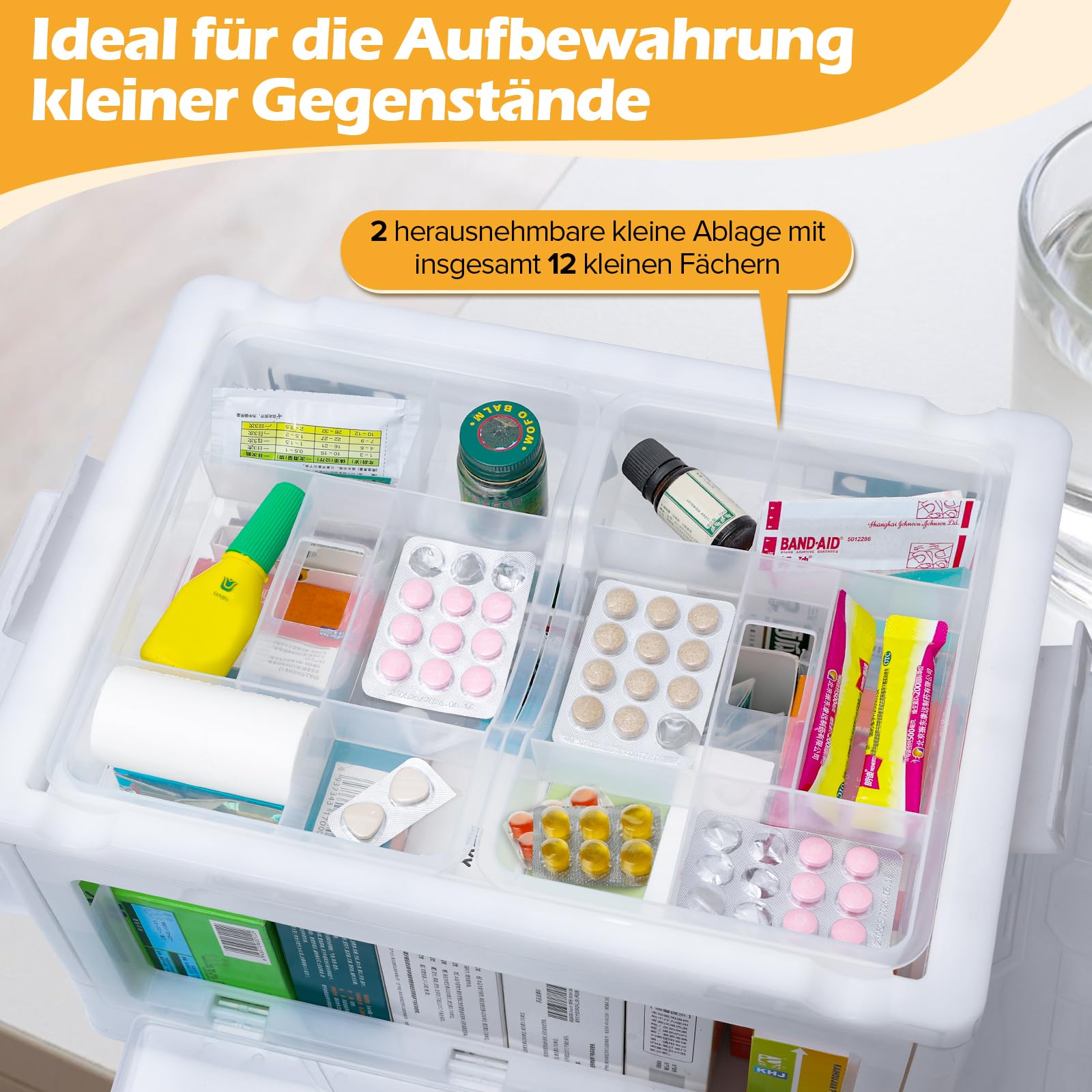 Drei separate Ebenen helfen beim Sortieren und schnellen Finden. Nicht nur für Medikamente geeignet, sondern auch perfekt für Bastelbedarf, Schreibwaren oder kleine Utensilien. Deine ultimative Aufbewahrungslösung!