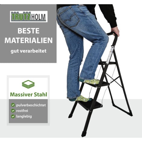 Du brauchst eine praktische Steighilfe für zu Hause? Die TRUTZHOLM 2-stufige Trittleiter ist genau das Richtige! Aus robustem Aluminium gebaut, wiegt sie nur 3,23 kg - super leicht zu tragen. Mit einer Tragkraft von 150 kg und TÜV/GS-Zertifizierung bist du sicher unterwegs. Die rutschfesten Trittflächen und gummierten Füße geben dir sicheren Halt und schonen deine Böden. Das Beste: Zusammengeklappt ist sie nur 5 cm schmal - perfekt zum Verstauen hinter Türen oder in Schränken. Ideal für die Küche, um an hohe Schränke zu kommen, im Kleiderschrank oder in der Werkstatt. Die Sicherheitsverriegelung verhindert ungewolltes Zusammenklappen. Einfach aufklappen, raufsteigen und deine Arbeit erledigen - so praktisch war Haushalt noch nie! Ob für Putzarbeiten, Dekorieren oder Reparaturen - diese Leiter ist dein bester Helfer.