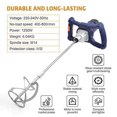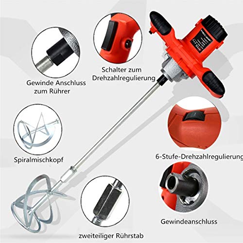 Wow, mit diesem Rührgerät geht das Mischen richtig ab! Mit stolzen 1500 Watt Power und nem puren Kupfermotor püriert der jede Mischung - ob Beton, Mörtel, Farbe oder sogar Teig in der Küche. Sechs Geschwindigkeitsstufen von 330 bis 930 U/min geben dir die totale Kontrolle. Der S-förmige Doppel-Blatt-Rührer verteilt alles super gleichmäßig und spart dabei noch Zeit und Strom. Das Gehäuse aus Aluminium mit vielen Lüftungsschlitzen sorgt dafür, dass nichts überhitzt. Der praktische Ein-Taste-Schalter und der verstellbare Griff machen die Bedienung mega einfach. Und wenn mal die Kohlebürsten gewechselt werden müssen - kein Problem, das geht ratzfatz von außen. Perfekt für Handwerker, Heimwerker und alle, die gerne mixen!
