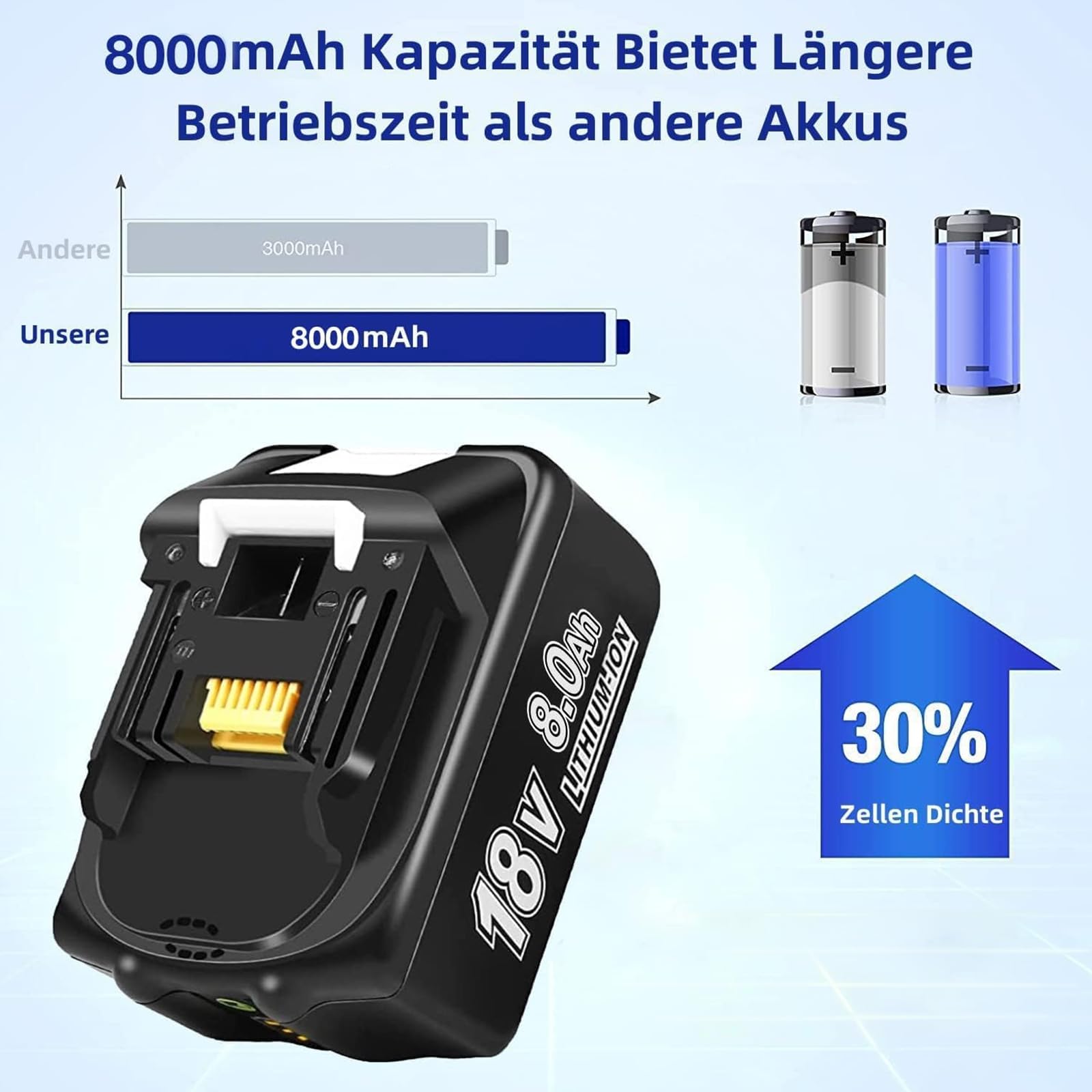 Hey, diese Makita Ersatzakkus sind einfach genial! Mit satten 8.0Ah Kapazität hast du richtig lange Power für deine Werkzeuge. Zwei Stück im Set - perfekt um immer einen geladenen Akku parat zu haben! Kompatibel mit so gut wie allen Makita 18V Geräten: BL1860, BL1850, BL1840, BL1830 und vielen mehr. Das LED-Anzeigesystem zeigt dir immer genau wie voll der Akku noch ist. Super praktisch! Mit integriertem Schutz vor Überlastung, Überhitzung und Kurzschluss - da brauchst du dir keine Sorgen machen. Einfach aufladen mit deinem Makita Ladegerät und los geht's! Ideal für Handwerker und Hobby-Heimwerker die länger durchhalten wollen. Die Akkus halten echt ewig und liefern konstant volle Power. Ob für Bohrschrauber, Sägen oder andere Elektrowerkzeuge - damit bist du bestens ausgestattet! Tipp: Beim ersten Mal komplett aufladen und bei Lagerung monatlich nachladen. So hast du lange Freude an den Akkus! Die Verarbeitung ist top und sie sitzen bombenfest in den Geräten. Einfach einstecken und lostackern - mehr Aufwand braucht's nicht!