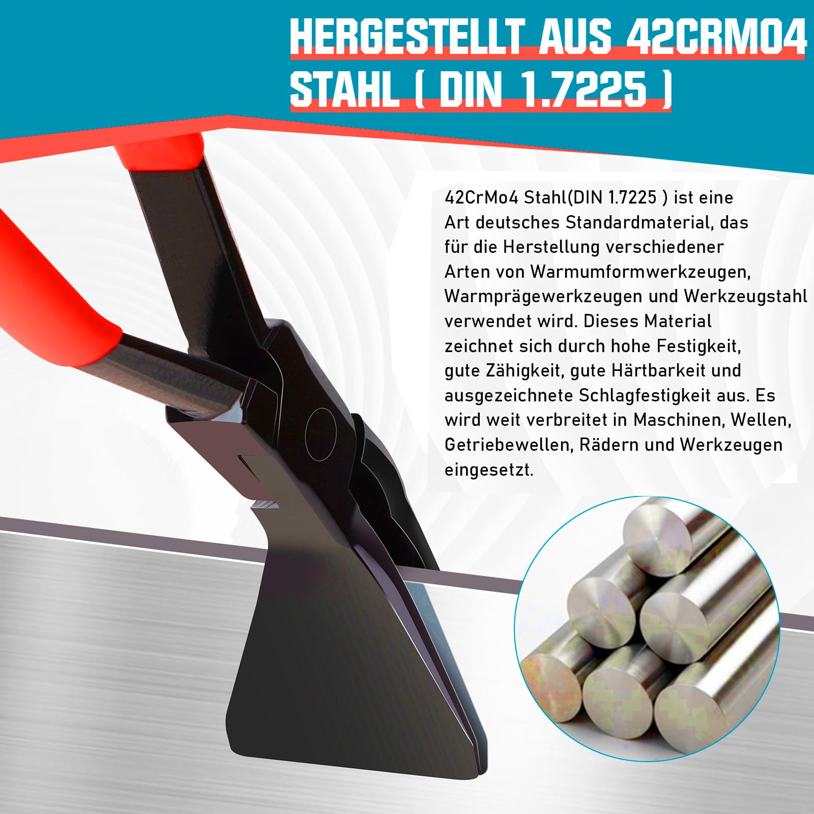 Professionelles Abkantzungen-Set für alle Metallarbeiten! Mit drei Winkeln: 0°, 45° und 90° - für jede Biegung perfekt geeignet. Aus hochwertigem 42CrMo4 Stahl, geschmiedet für maximale Festigkeit. Die parallelen Backen verhindern Kratzer im Blech. Mit rutschfesten Griffen für sicheres Arbeiten. Phosphatierte Oberfläche schützt vor Rost. Länge 280mm, Maulbreite 60mm - ideal für Dachdecker und Spengler. Kommt im praktischen Werkzeugkasten - alles sicher verstaut!