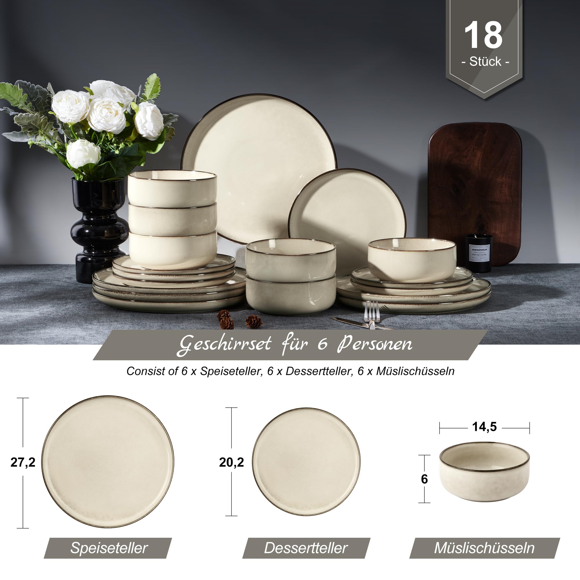 Im Set enthalten: 4 Speiseteller (26cm), 4 Dessertteller (20.2cm) und 4 Müslischüsseln (14.2cm). Aus hochwertigem Steinzeug, zweifach gebrannt für extreme Stabilität. Jedes Stück ist handbemalt und ein Unikat!