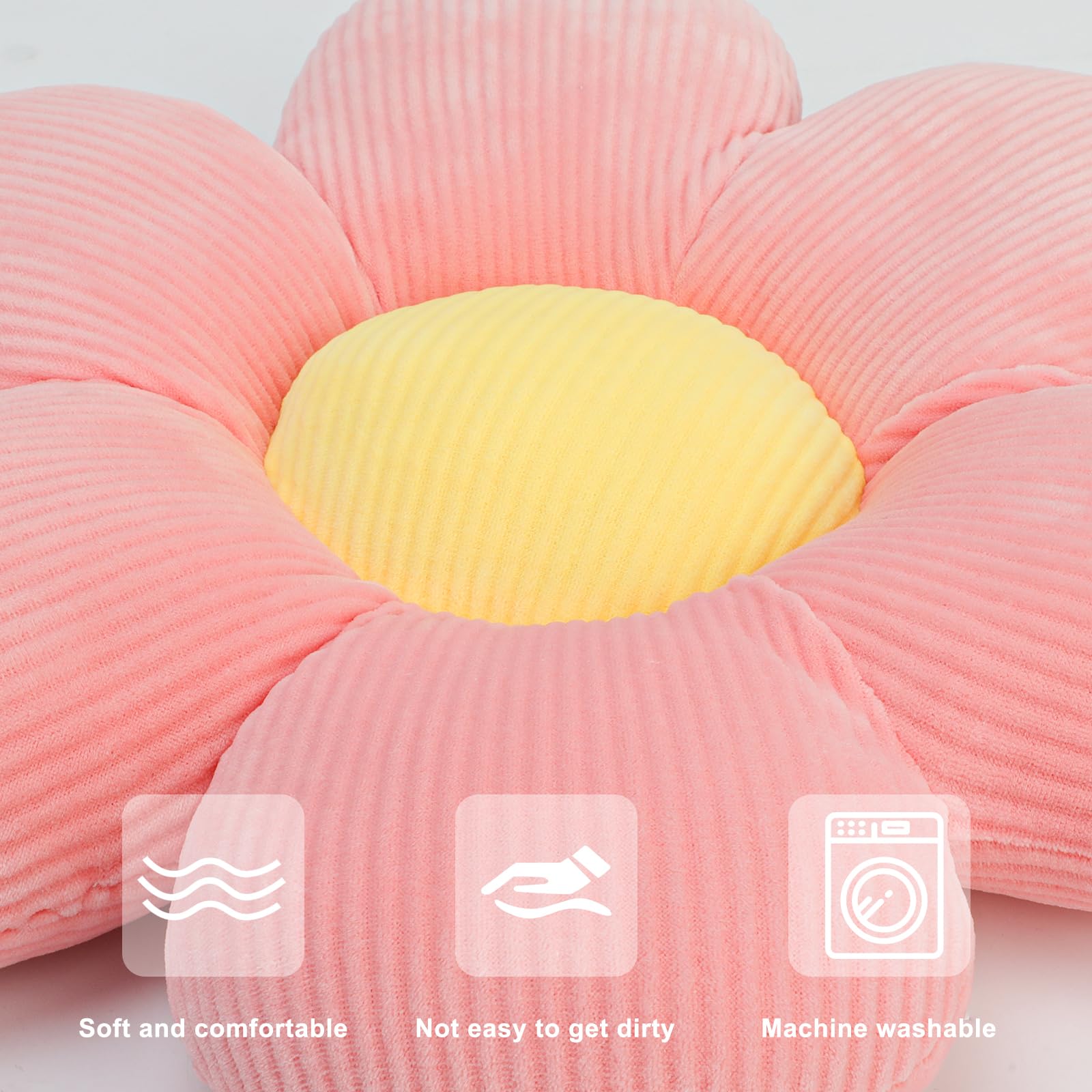 Wie niedlich sind denn diese Blumenkissen? Das 2er-Set in Gelb und Weiß sieht nicht nur super hübsch aus, sondern ist auch mega bequem! Jedes Kissen hat 38 cm Durchmesser und die Blütenblätter sind richtig schön voluminös gepolstert. \\n\\nDer Stretchplüsch ist total weich und hautfreundlich, die Füllung aus PP-Baumwolle gibt angenehm nach ohne platt zu sitzen. Perfekt fürs Wohnzimmer, wenn man mal auf dem Boden sitzt, als extra Sitzpolster auf der Couch oder sogar als gemütliche Fußmatte. \\n\\nDie frischen Farben bringen sofort gute Laune in jeden Raum! Ob im Kinderzimmer, im Yogaraum oder einfach als Deko-Element - diese Kissen sind echte Allrounder. Und was ich besonders liebe: Sie verformen sich nicht, auch nicht nach längerem Sitzen. Machen sich übrigens auch super als Geschenk - welches Mädchen würde sich nicht über diese süßen Blümchen freuen?
