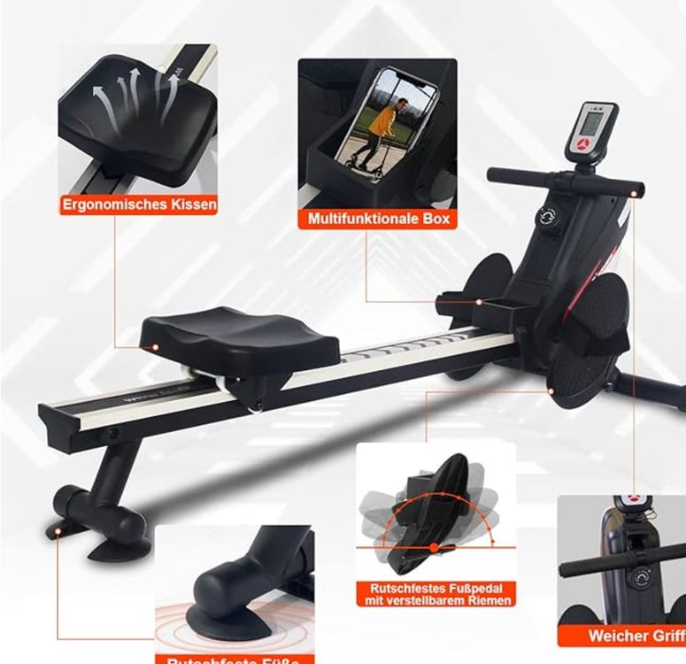 Willst du fit werden ohne Studio? Das Riksion Rudergerät bringt das Ganzkörpertraining zu dir nach Hause! Mit 16 magnetischen Widerstandsstufen ist es perfekt für Anfänger und Profis. Das LCD-Display zeigt dir alle wichtigen Daten: Kalorien, Zeit, Distanz und mehr. Bis zu 160kg Belastbarkeit und für Körpergrößen von 145-195cm geeignet. Der Aufbau ist super einfach - in 30 Minuten bist du startbereit! Und das beste: Es ist mega leise (unter 10 dB), also keine Angst vor genervten Nachbarn. Die drehbaren Pedale mit verstellbaren Riemen passen sich jeder Schuhgröße an. Nach dem Training einfach vertikal verstauen - perfekt für kleine Wohnungen. Trainiere bis zu 90% deiner Muskeln: Beine, Rumpf, Arme, Schultern. Mit den Transportrollen schiebst du es easy durch die Wohnung. Profi-Qualität für dein Home-Gym. Starte noch heute deine Fitness-Reise - dein Körper wird es dir danken!