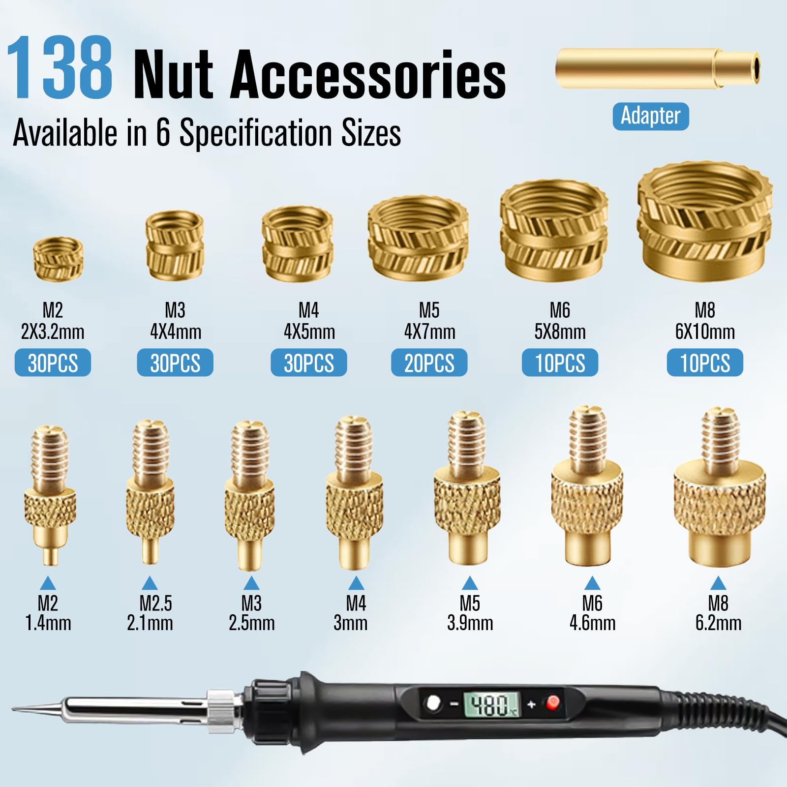 Professionelles Löt-Set für alle Bastler und Handwerker! 🔌 Der 80W Lötkolben heizt superschnell in nur 15 Sekunden auf und bietet stufenlose Temperaturregelung von 180-500°C. Mit klarer LED-Anzeige für präzise Kontrolle. Das Besondere: 6 Gewindeeinsatz-Adapter (M2-M8) und 5 verschiedene Lötspitzen für alle Anwendungen. Enthält 130 hochwertige Messing-Gewindeeinsätze für perfekte Ergebnisse. Ideal für 3D-Druck Zubehör, Holzverbindungen, Elektronikgehäuse und Reparaturen. Das modulare System ermöglicht schnellen Spitzenwechsel ohne Werkzeug - einfach abkühlen lassen und wechseln! Ergonomischer, hitzebeständiger Griff für ermüdungsfreies Arbeiten. Vier Kühlöffnungen sorgen für stabile Temperatur und Sicherheit. Netzbetrieb für konstante Leistung. Komplett-Set mit allem was du brauchst - vom Hobbybereich bis zum professionellen Einsatz. Einfach einschalten, Temperatur einstellen und loslöten!