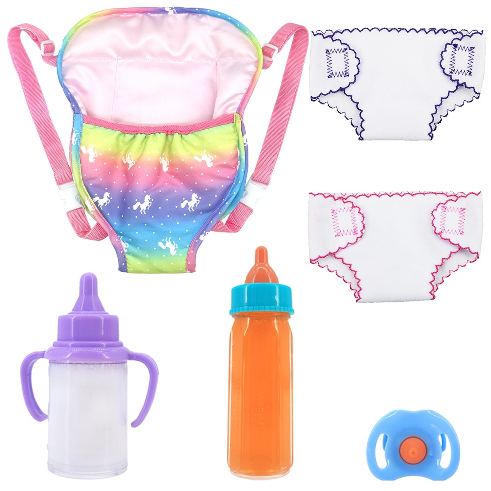 Kleine Puppenmuttis aufgepasst! Dieses magische Fläschchen-Set bringt riesigen Spielspaß. Die Flasche hat 'verschwindende' Milch - wenn das Kind die Puppe füttert, wird weniger Flüssigkeit, aber sie ist immer da! Total faszinierend für Kinder. Im Set: 2 magische Flaschen, 2 Puppenwindeln, 1 Babytrage und 1 Schnuller. Alles aus sicherem, ungiftigem Kunststoff und Stoff. Perfekt für Babyborn und andere Puppen. Fördert Rollenspiele, Empathie und Verantwortungsbewusstsein. Die Flasche ist luftdicht, nichts läuft aus. Einfach die Puppe füttern, windeln und in der Trage herumtragen - wie bei einem echten Baby! Perfektes Geschenk für kleine Puppeneltern. Macht das Spielen noch realistischer und lehrreicher. Achtung: Nur für Spielzeugpuppen, nicht für echte Babys!