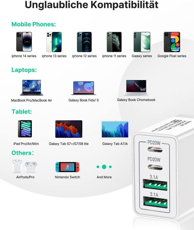 Nie mehr streiten um die Ladesteckdose im Auto! Dieses praktische Ladegerät hat 4 USB-Anschlüsse: drei mit je 3,1A und einen Super-Schnellladeport mit 66W. So kannst du mehrere Smartphones, Tablets oder andere Geräte gleichzeitig laden. Mit Sechsfach-Schutz vor Überhitzung, Kurzschluss und Überspannung ist es absolut sicher für dein Auto und deine Geräte. Die blaue LED zeigt an, wenn es eingesteckt ist. Kompakt und leicht passt es in jedes Handschuhfach. Einfach in den Zigarettenanzünder stecken und schon geht's los - ideal für Familienausflüge, Geschäftsreisen oder lange Roadtrips. Endlich genug Power für alle!