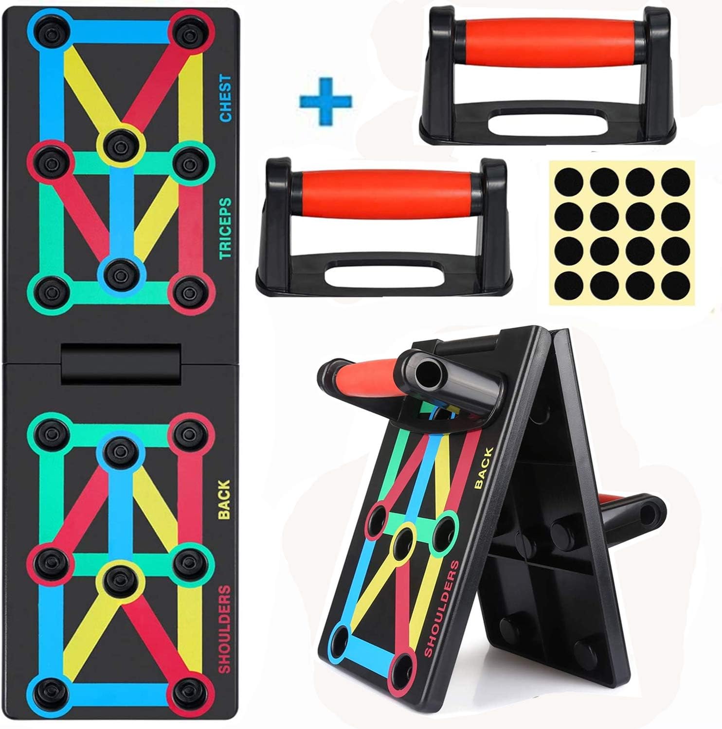 Wow, mit diesem 12-in-1 Liegestützbrett trainierst du wirklich deinen ganzen Körper! Das farbcodierte System zeigt dir genau, wo du deine Hände platzieren musst für verschiedene Muskelgruppen: Blaue Zone für die Brust, Rot für Schultern, Grün für Bizeps und Gelb für den Rücken.