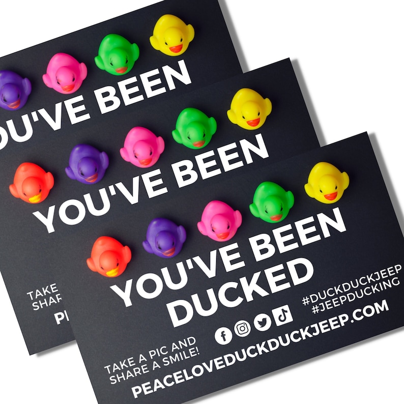 You've Been Ducked - das lustige Spiel das gerade alle verrückt macht! Im Set mit 20 gelben 3D-Gummienten, 20 schwarzen Enten-Anhängern (6,3x6,3cm) und 20 Gummibändern. Einfach die personalisierbaren Tags mit deinem eigenen Text beschriften und an den Enten befestigen. Perfekt um Leute zu 'entern' - heimlich eine Ente mit persönlicher Nachricht hinterlassen! Ob für Freunde, Kollegen oder Familie - sorgt immer für Lacher. Die Karten haben auf der Rückseite Platz für deine individuelle Botschaft. Super für Partys, als Büro-Gag oder einfach um jemandem eine Freude zu machen. Mach mit bei dem Trend der alle quaken lässt! Einfach genial und mega witzig!