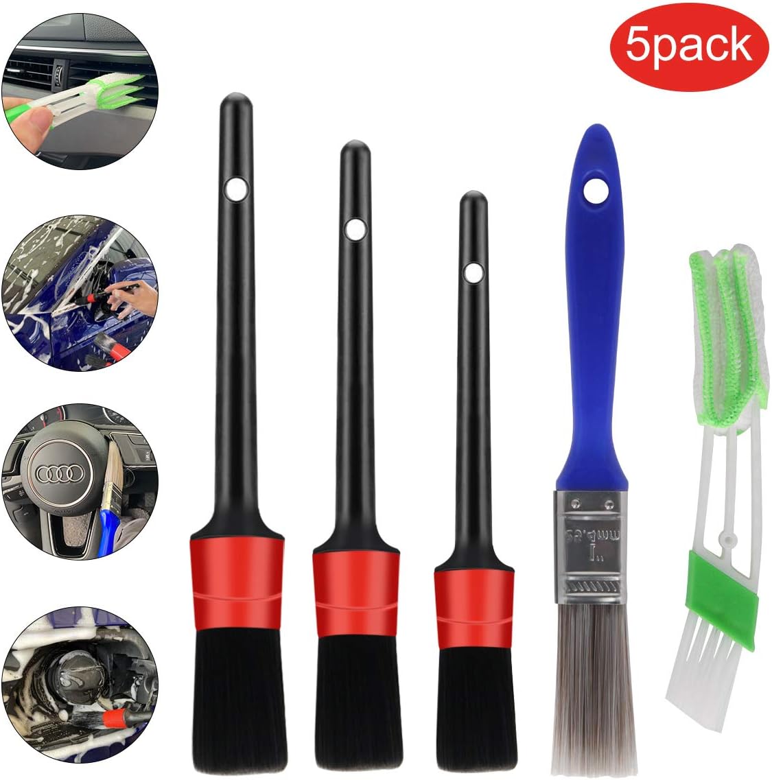 Mit diesem praktischen 5-teiligen Bürsten-Set wird die Auto-Reinigung zum Kinderspiel! Enthalten sind 3 Präzisionsbürsten und 2 spezielle Lüftungsbürsten, mit denen du wirklich jede Ecke erreichst. Die weichen aber festen Microfaser-Borsten entfernen Schmutz rückstandslos, ohne Kratzer auf empfindlichen Oberflächen zu hinterlassen. Besonders praktisch: Die geschwungene Form der Bürsten ermöglicht die Reinigung von schwer zugänglichen Stellen wie Lüftungsschlitzen, Sitzspalten und Armaturenbrett-Ecken. Hergestellt aus hochwertigen PP-Materialien komplett ohne Metall - so besteht keine Kratzgefahr! Die ergonomischen Griffe liegen gut in der Hand und die borstenstarken Bürsten sind geruchsneutral und langlebig. Perfekt für Nass- und Trockenreinigung, sowohl im Innenraum als auch im Motorraum. Einfach nach Gebrauch mit Wasser abspülen, trocknen lassen und für den nächsten Einsatz bereithalten. Das komplette Set für eine gründliche Auto-Pflege!