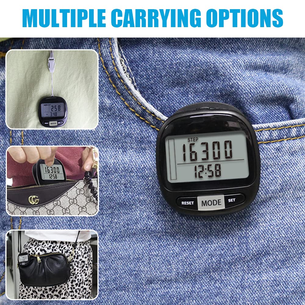 Wow, dieser 3D-Schrittzähler ist ja mal richtig smart! Mit seiner 3D-Dreiachsen-Sensortechnologie zählt er deine Schritte super präzise – egal ob du das Ding vertikal, horizontal oder in nem Winkel trägst. Erfasst bis zu 99.999 Schritte! Das große Display zeigt alles gut lesbar an, und nach ner Minute ohne Bewegung schaltet er automatisch auf Uhrzeit um. Sobald du wieder loslegst, zählt er weiter. Aber er kann noch mehr: Er zeigt dir auch verbrannte Kalorien, zurückgelegte Distanz und Trainingsdauer an. So planst du deine Workouts besser und bleibst motiviert. Kein Schnickschnack mit Apps oder Bluetooth – einfach die Reset-Taste 5 Sekunden drücken, und schon geht's los. Wiegt nur 32 Gramm (wie n halbes Ei!) und hat nen abnehmbaren Clip. Perfekt für Tasche, Hosenbund oder Gürtel. Mit MODE wechselst du zwischen Uhrzeit, Schritten, Distanz und Kalorien. SET haltest du 2 Sekunden für Einstellungen (12/24h, Stunden, Minuten, Einheiten, Schrittlänge, Gewicht). Und RESET 3 Sekunden im Sportmodus löscht die Daten. Einfach, praktisch, genau – dein perfekter Begleiter für mehr Bewegung!